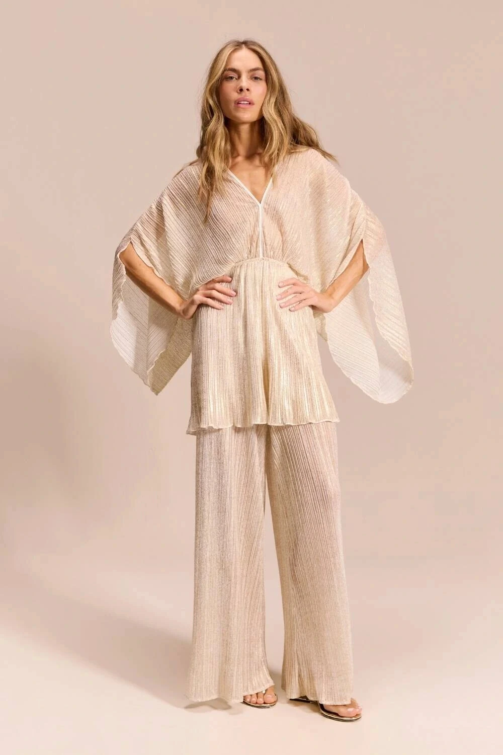 A Saída Antonela curta adiciona frescor e sofisticação ao visual, enquanto a Calça Solene reta equilibra a composição com linhas alongadas e caimento impecável. A tonalidade off dourado ilumina a produção com discrição, evocando o clima ameno e a essência autoral da temporada.