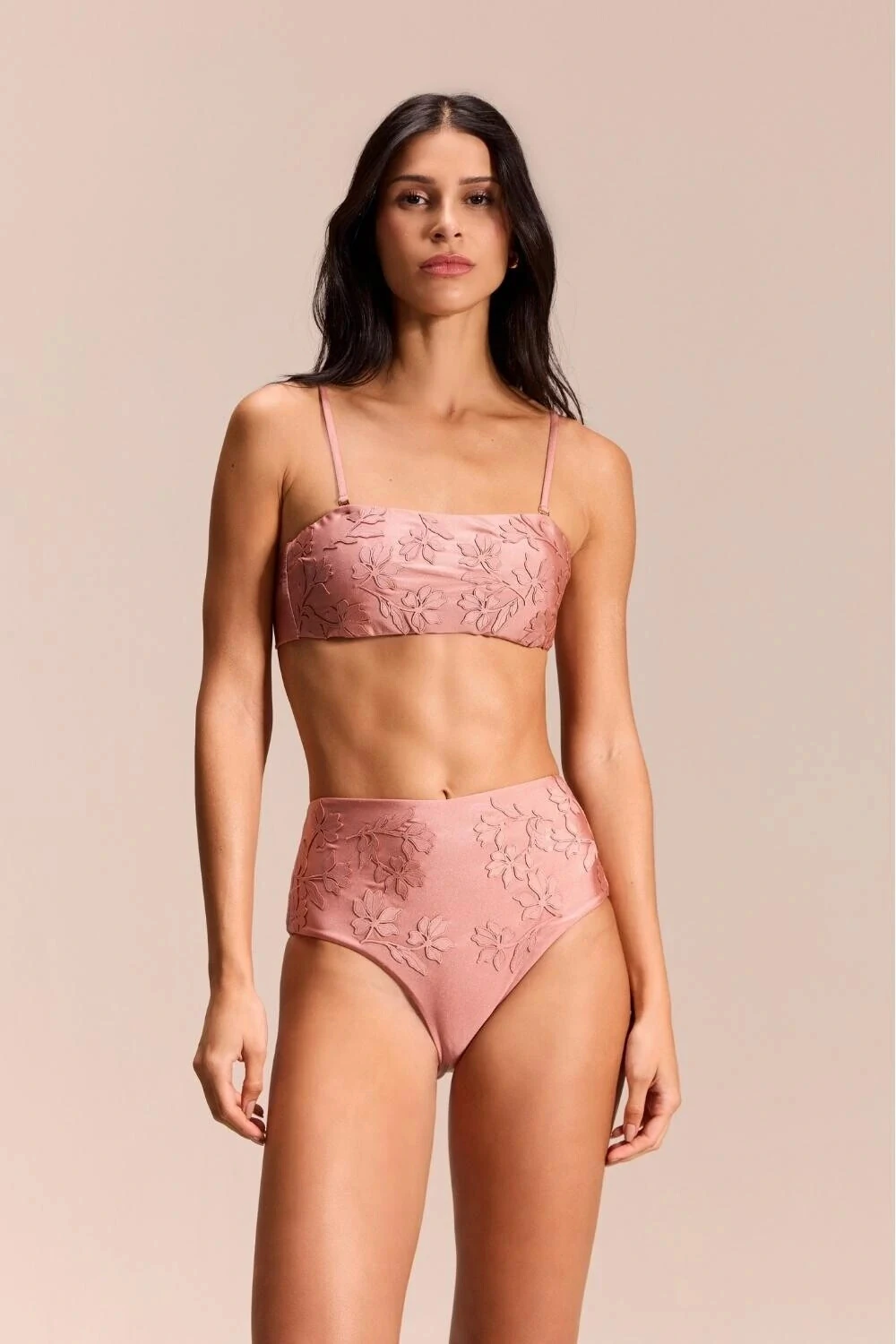 A calcinha hot pant complementa o conjunto com design clássico e caimento confortável, valorizando a silhueta com elegância. A mesma textura floral em relevo, aliada ao acabamento acetinado, reflete o espírito solar e refinado da coleção Alto Verão. Versátil e atemporal, o Conjunto Guine transita com charme do beachwear às produções resort, ideal para quem busca sofisticação à beira-mar.