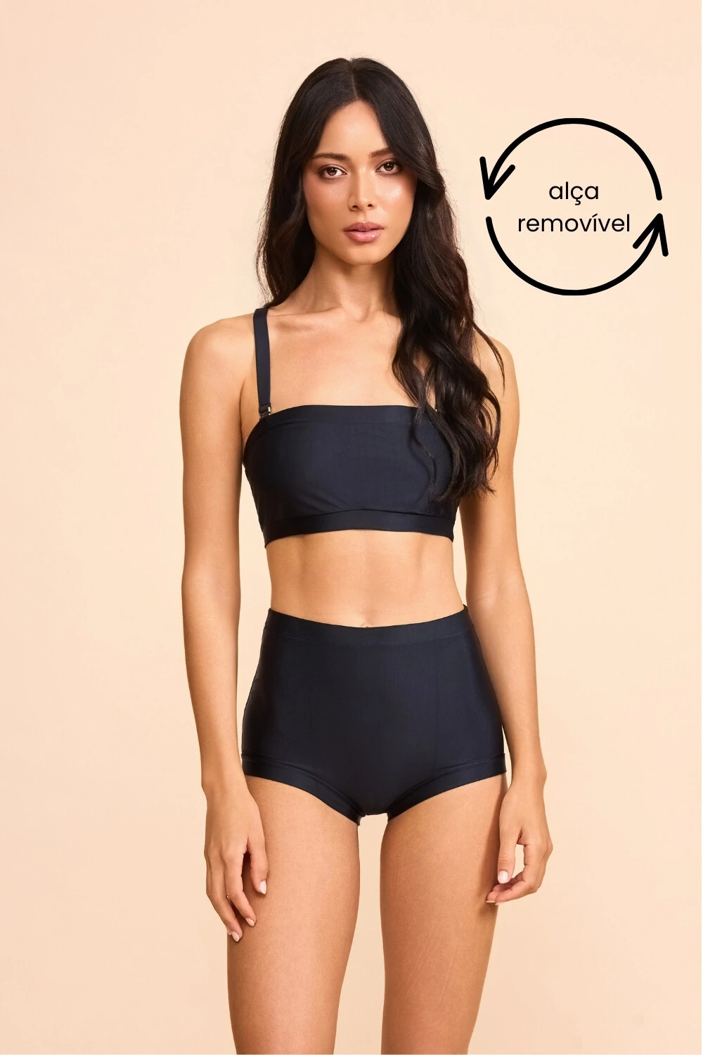 O top faixa estruturado valoriza o busto com sustentação confortável e conta com alças removíveis, permitindo diferentes formas de uso — com alças para maior suporte ou tomara-que-caia para um visual mais clean e elegante.