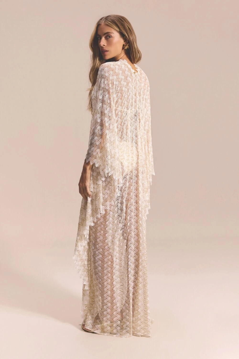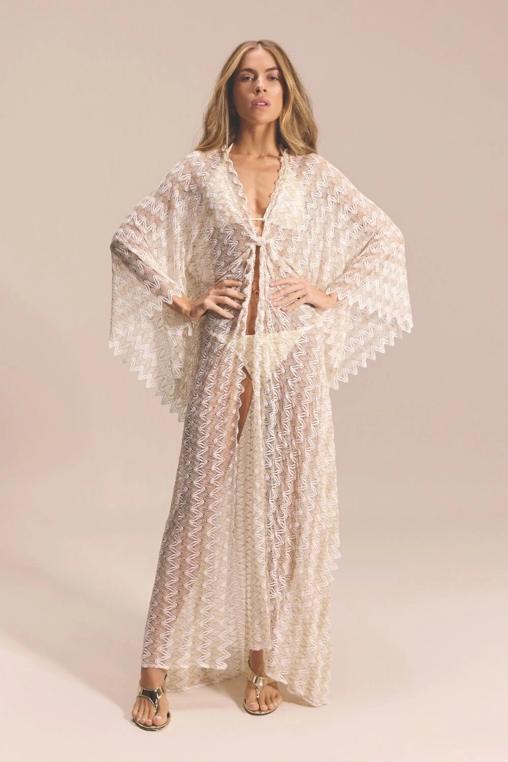O kaftan Julie é a expressão máxima da sofisticação descomplicada. Feito em renda zig zag off-white e dourada, possui fechamento por nó frontal, permitindo ajuste na altura e na largura. Leve e elegante, é ideal para quem busca uma saída longa que alia conforto e estilo.