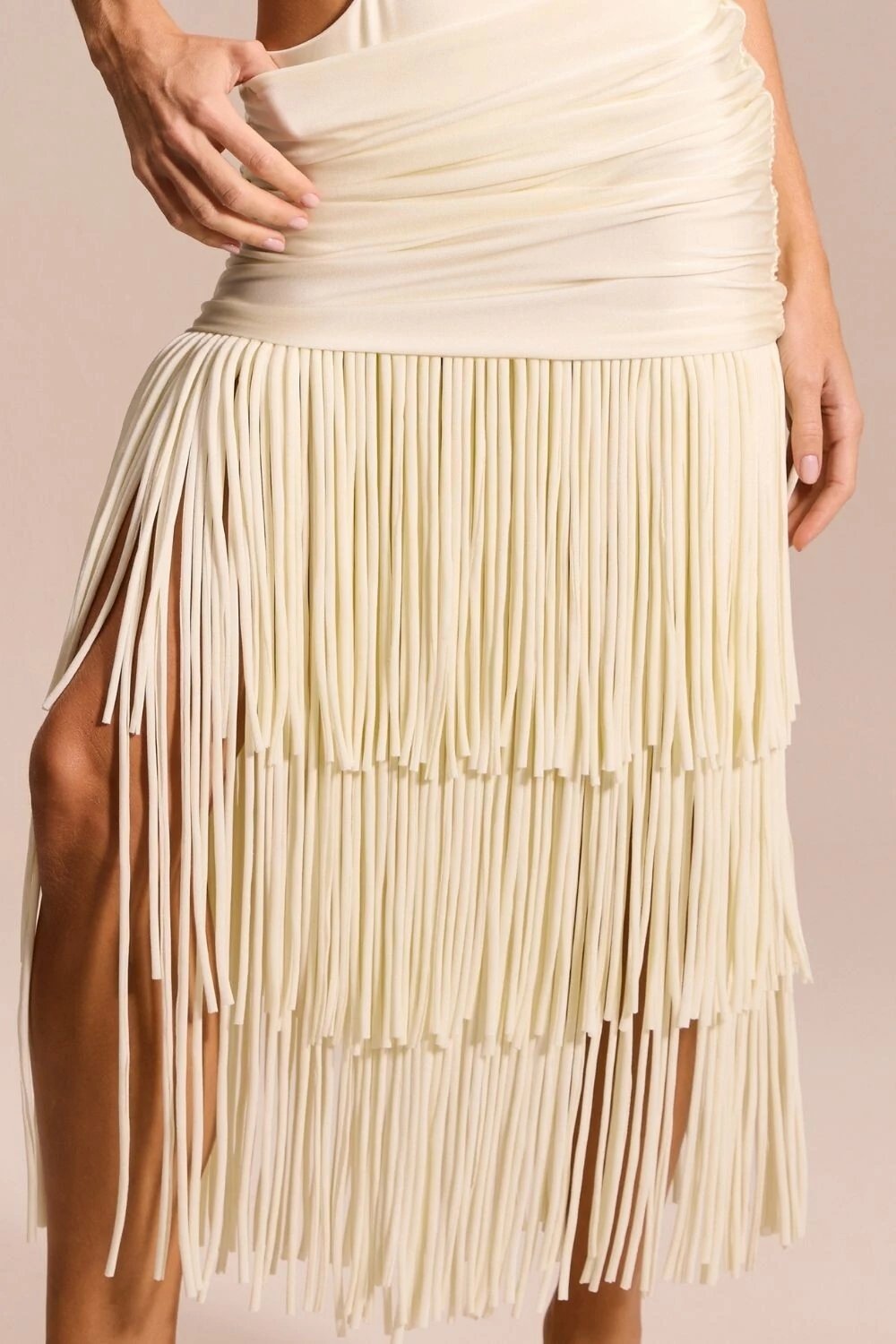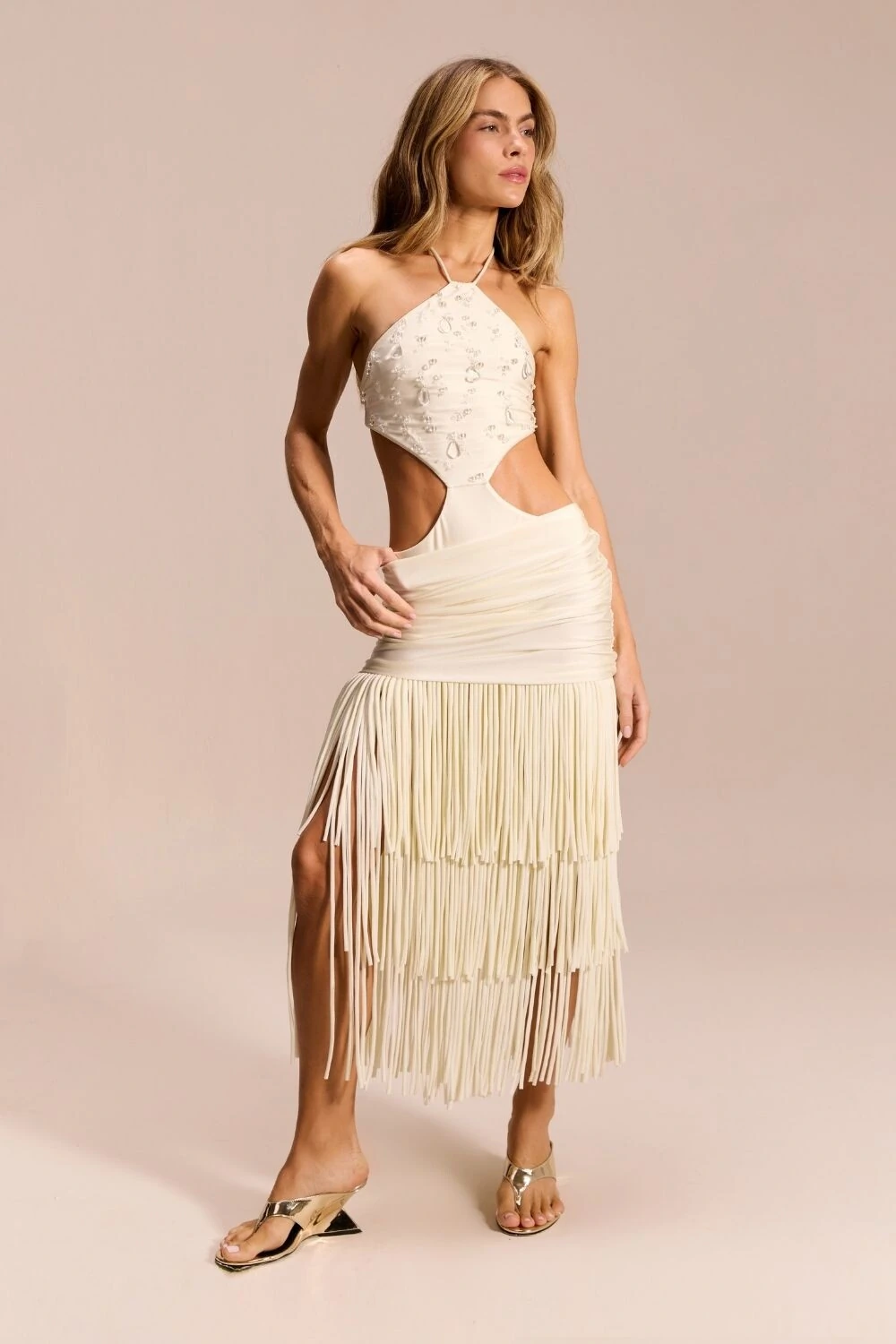A Saia Pico midi, em tecido fluido, sugere versatilidade. A cor pérola revela o espírito do verão, perfeita para ser usada em momentos de sol. Composição: 84% Poliamida - 16% Elastano