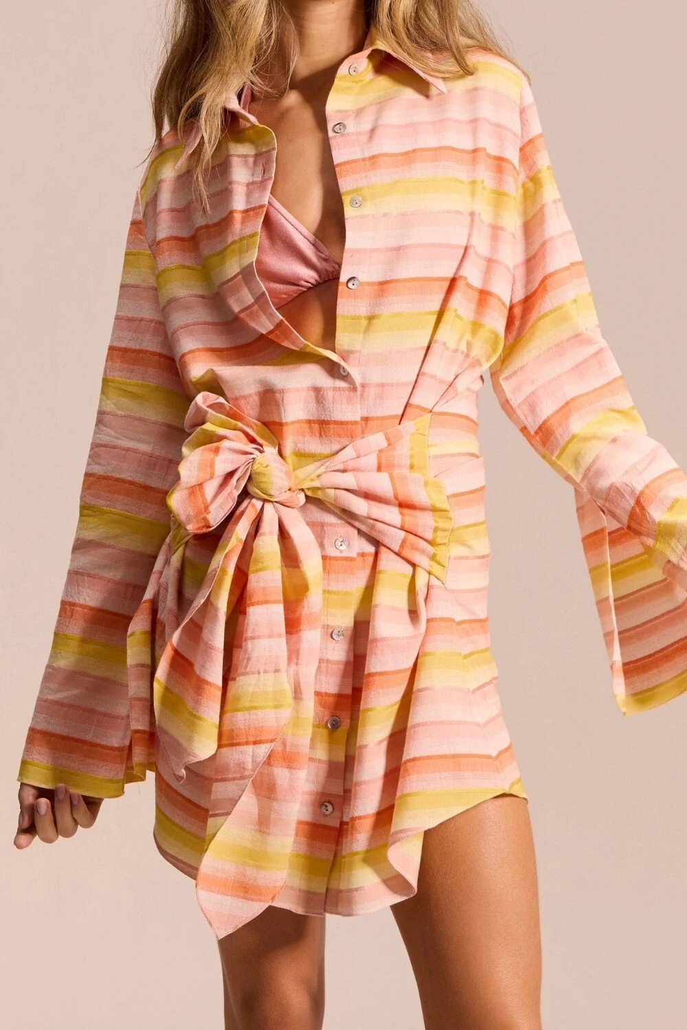 A Saída Brac curta, em modelagem fluida, representa a harmonia. A padronagem listrada evoca o resortwear, sendo ideal para o clima tropical. Composição: 64% Algodão - 34% Poliester