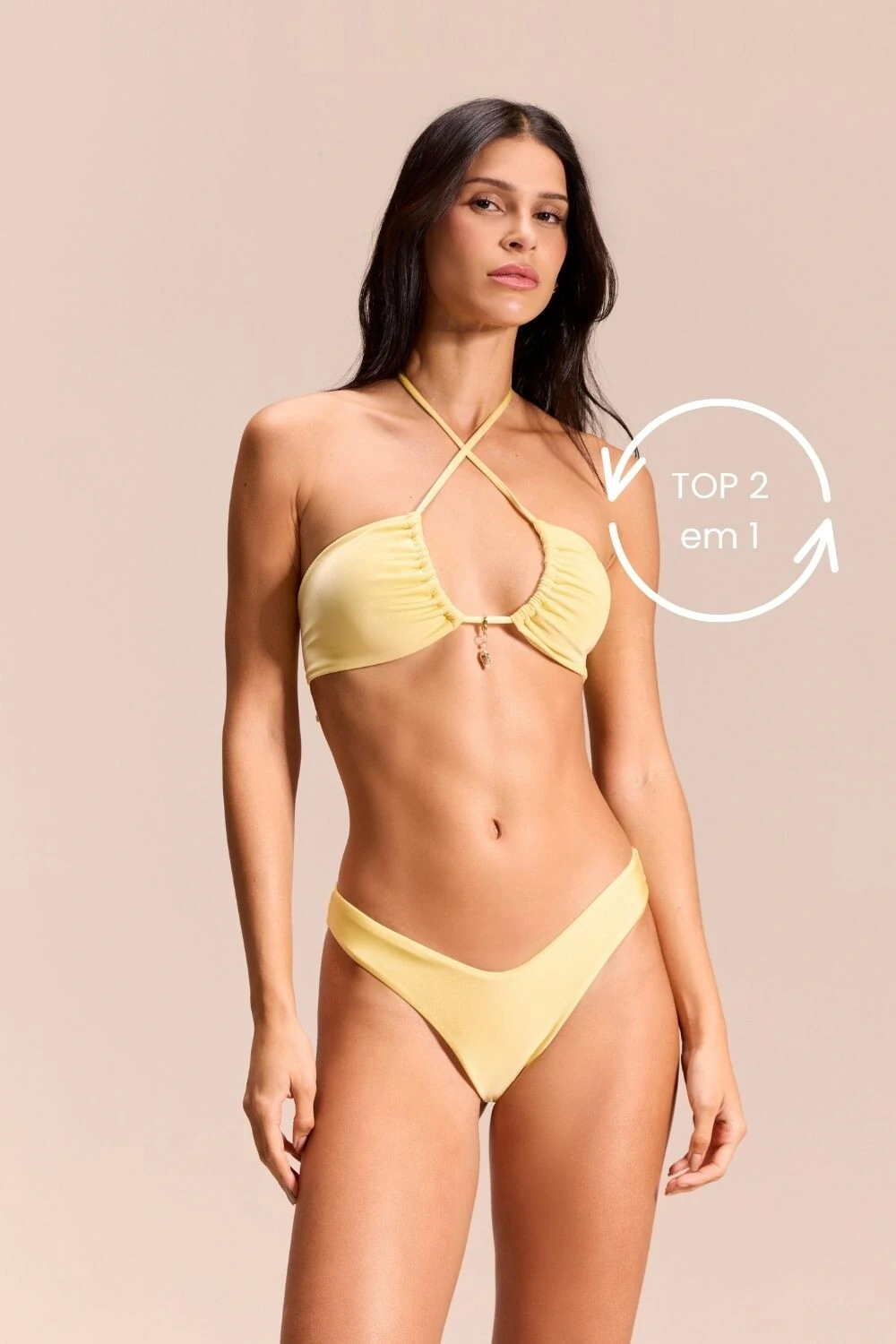 O Top Verona traduz versatilidade e charme no estilo MOS Beachwear. O modelo em amarelo vibrante apresenta decote ajustável e alças multifuncionais, permitindo diferentes formas de amarração - no pescoço, cruzado ou tomara que caia - adaptando-se a cada ocasião.