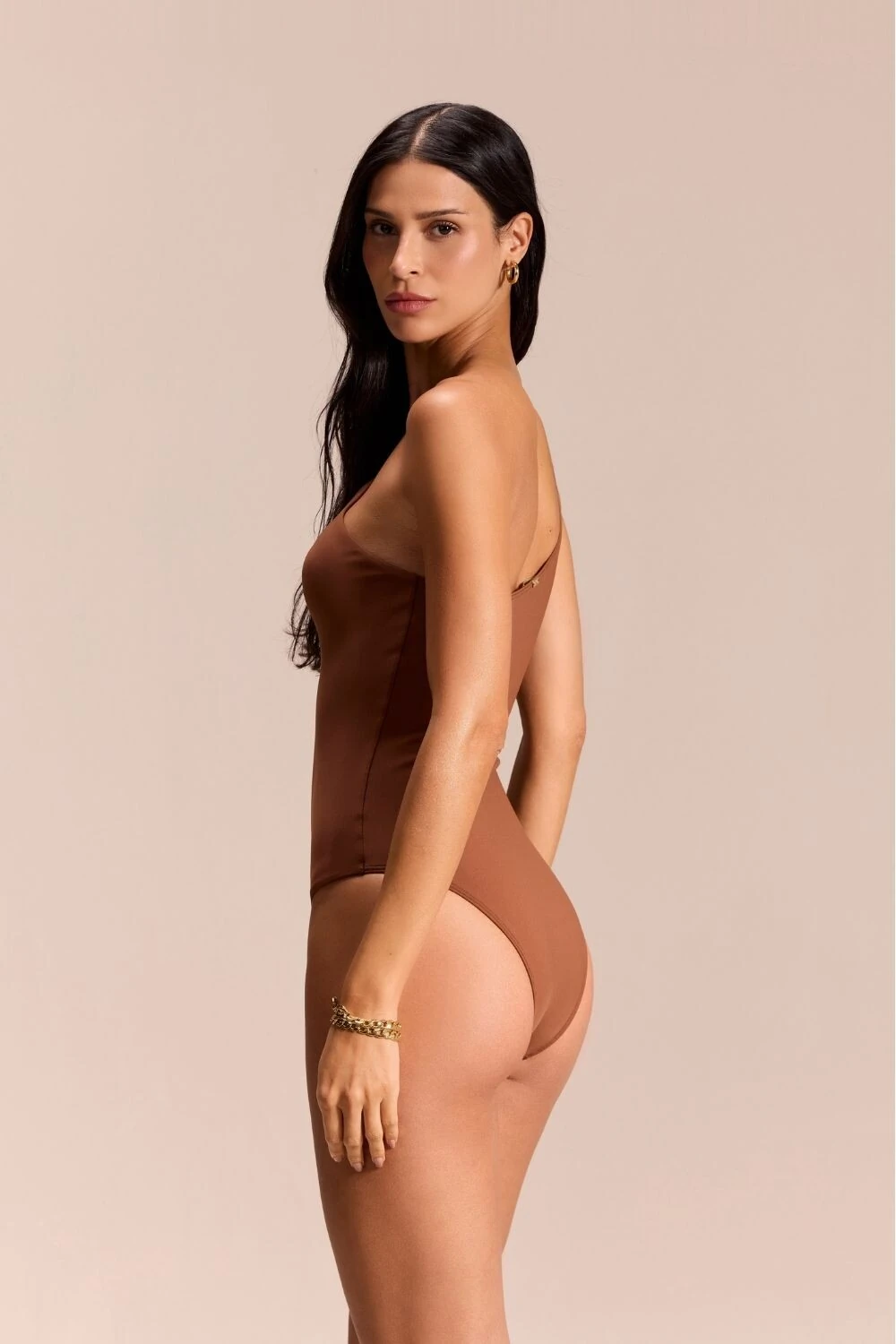O Maiô Concha Dourada é uma peça ícone da coleção Alto Verão MOS Beachwear, combinando elegância minimalista e luxo artesanal. Em tom marrom café, apresenta modelagem de um ombro só com drapeado leve e detalhe em aviamento metálico dourado em forma de concha, feito à mão.