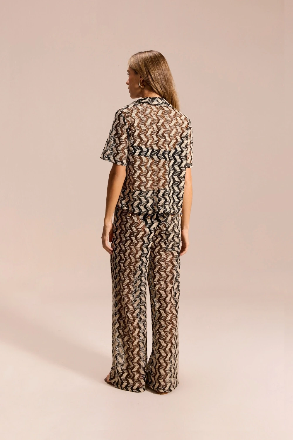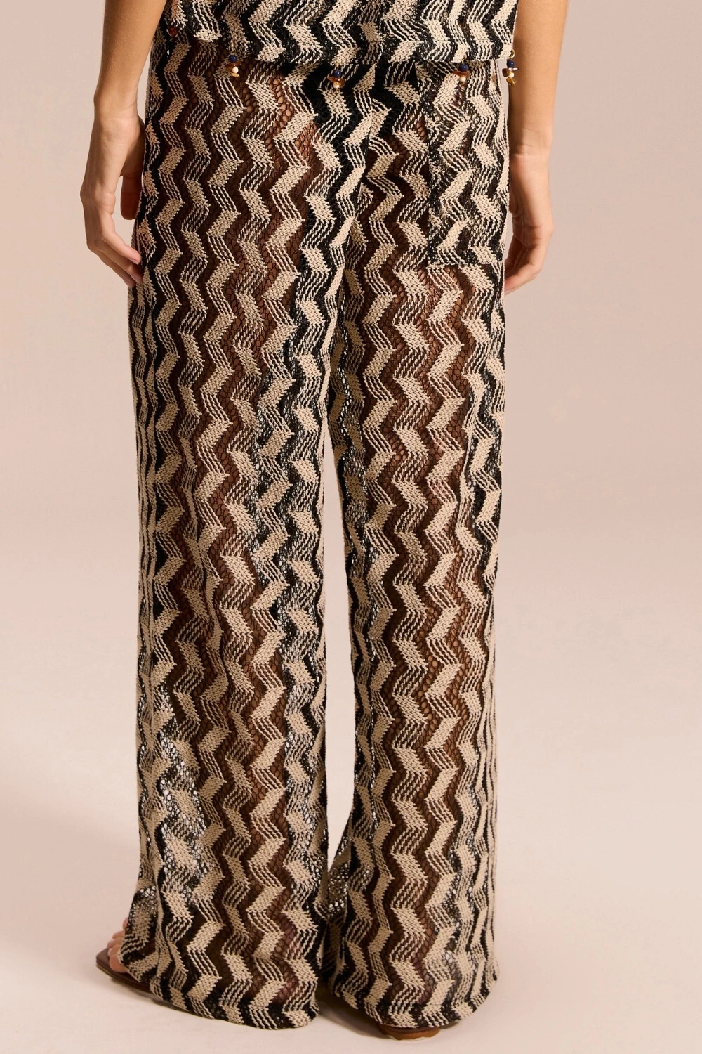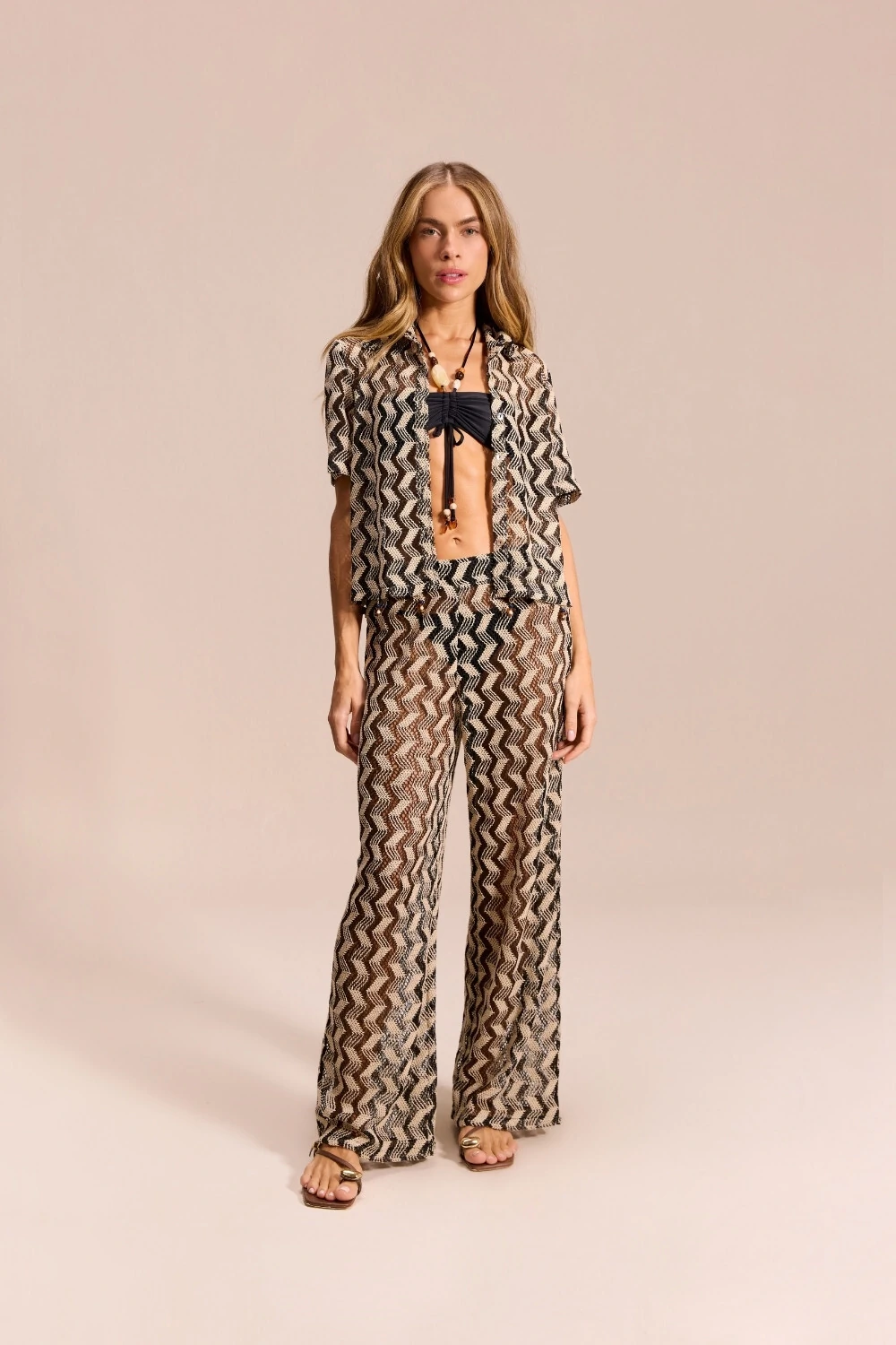Características: Calça de modelagem ampla com caimento fluido, que alonga a silhueta e garante elegância em cada passo. O tecido com padrão zig zag em preto cria um efeito visual marcante, perfeito para coordenar com tops de beachwear, camisas leves ou conjuntos coordenados. Versátil, pode ser usada como saída de praia sofisticada ou em produções urbanas com sandálias e acessórios statement.