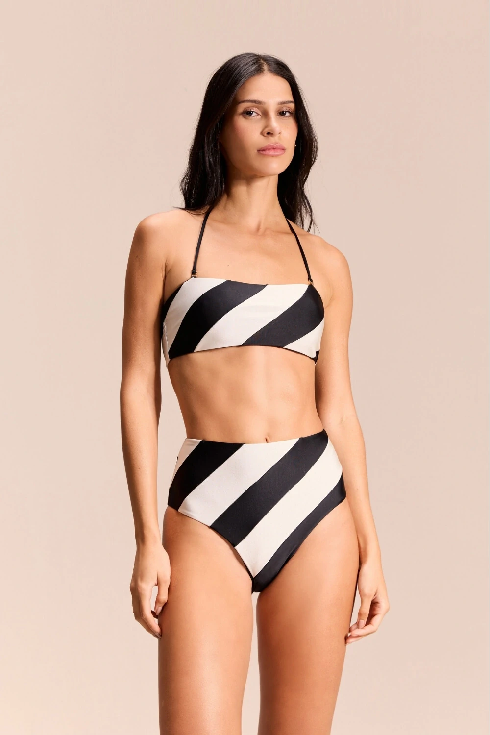 Características: Calcinha de cintura média com cobertura equilibrada e caimento confortável. As listras diagonais em preto e off-white criam um efeito visual moderno que harmoniza perfeitamente com o Top Taiti. Ideal para compor um conjunto marcante, versátil e elegante para dias de praia, piscina ou destinos resort.