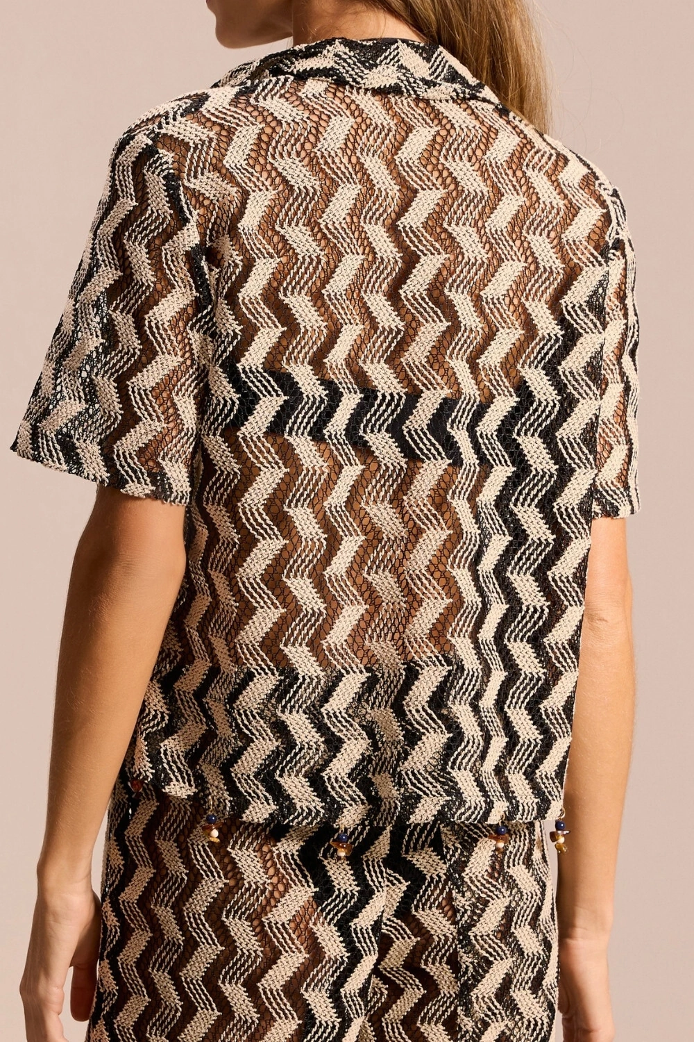 Características: Camisa de modelagem reta com caimento fluido e mangas curtas amplas, ideal para compor produções coordenadas ou sobreposições sofisticadas. O padrão zig zag em renda não é estampa, mas resultado da própria construção do tecido, garantindo relevo sutil e aspecto premium. Pode ser usada aberta como sobreposição de beachwear ou fechada para um look urbano leve e elegante. Perfeita para compor conjunto com a Calça Caieiras ou combinar com peças neutras.