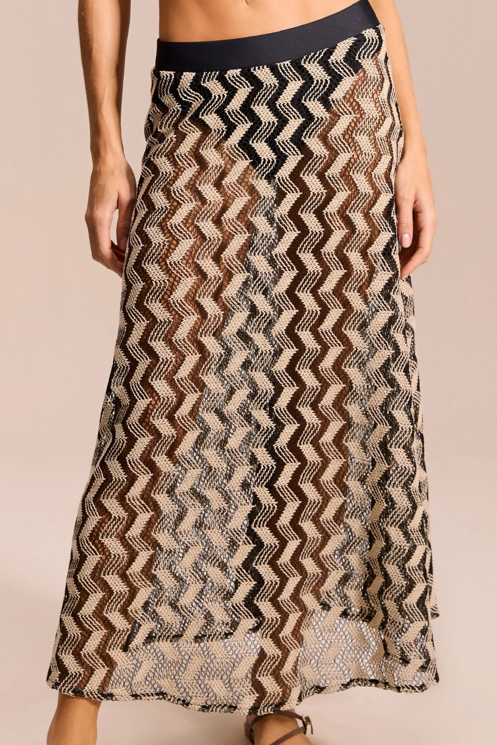 Características: Saia de comprimento midi com modelagem reta e caimento fluido, que acompanha o corpo com leveza e naturalidade. O padrão zig zag é construído na própria renda, garantindo relevo sutil e aspecto premium — não se trata de estampa. A transparência delicada do tecido adiciona profundidade ao visual, tornando a peça perfeita como saída de praia sofisticada ou para compor produções resort chic com tops estruturados e sandálias minimalistas.