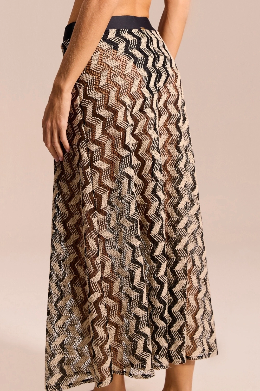 A Saia Couves traduz leveza e sofisticação em uma proposta elegante para o beachwear contemporâneo. O tecido zig zag preto em renda cria textura e movimento com acabamento refinado.